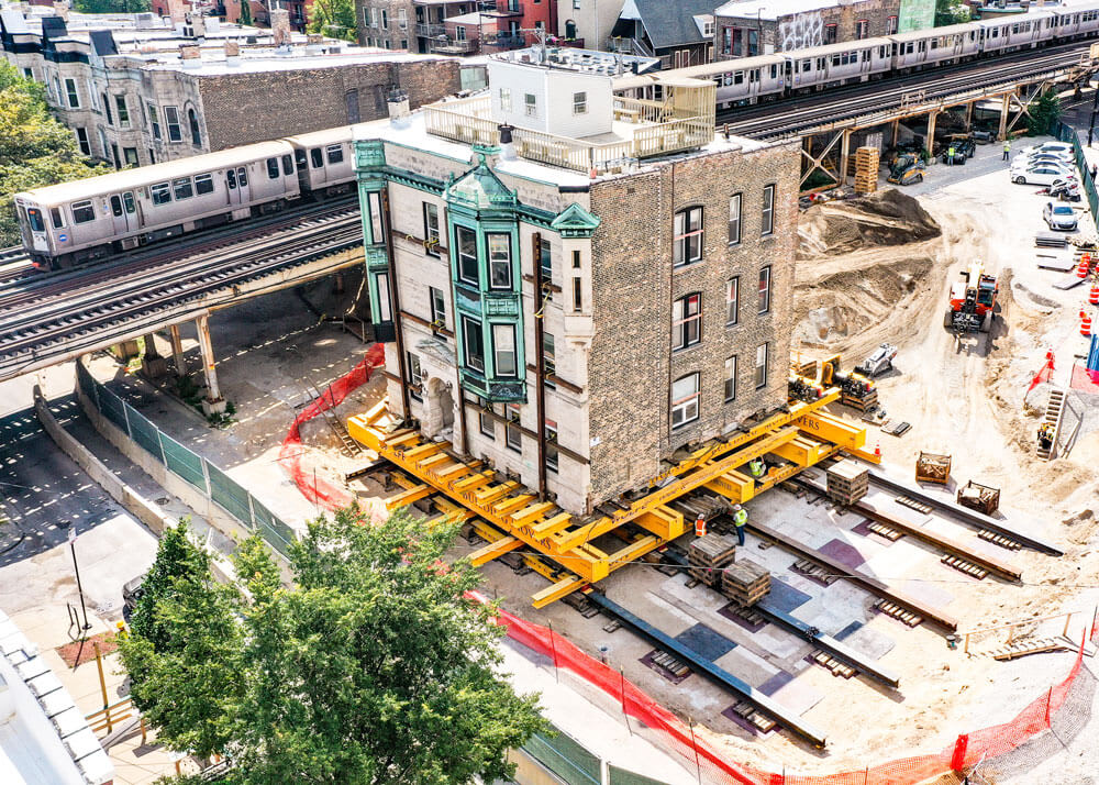 “The Vautravers Building final preparation for relocation on August 2, 2021. The historic three-story Lakeview apartment building will be moved about 26 feet to the west to avoid the new elevated rail line.