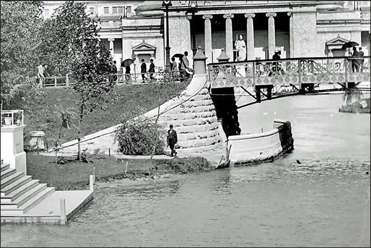 The Columbia Basin was the northernmost part of the Exposition’s lagoon system, and it fronted the monumental Atwood-designed Fine Arts Building, now the Griffin Museum of Science and Industry. While much of Jackson Park was completely redesigned during the fair, the basin’s form remained and became part of the interconnected series of lagoons. The Columbia Drive Bridge also remained one of the only unchanged and extant pieces of the original design for the park, with Burnham & Root adding ornamental railings to improve both its safety and aesthetic appeal. The bridge’s placement was part of Olmsted’s vision to create picturesque views of the Fine Arts Building. Standing on the bridge, a fair-goer would experience a naturalistic vista, where the grand neoclassical building was framed by grassy slopes, clusters of trees and the basin itself. During the fair, tens of millions of visitors crossed the Columbia Drive Bridge, and traveled in boats beneath it.