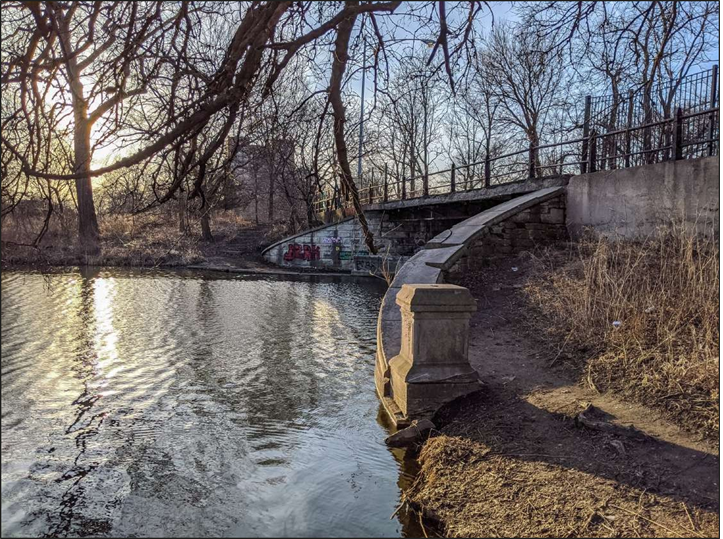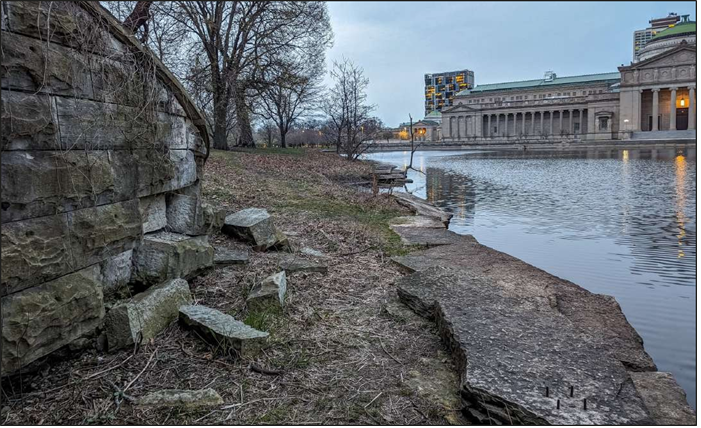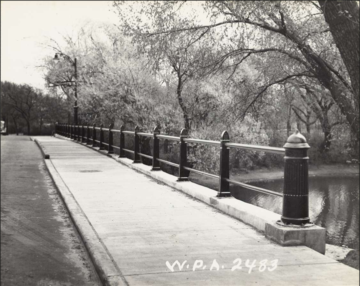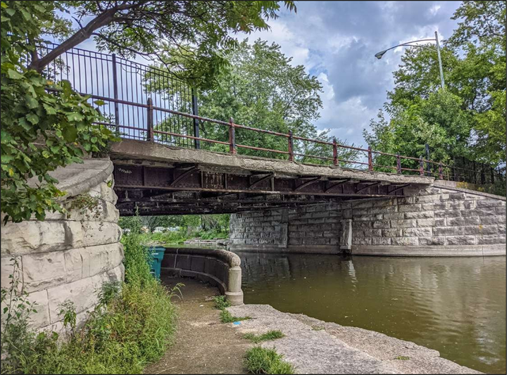 Dating back to the earliest phase of Jackson Park’s development and predating the 1893 World’s Columbian Exposition, the bridge’s current structure includes components from different time periods. The stone abutment walls were constructed in 1880, when Burnham & Root designed the original pony-truss bridge to accompany Olmsted & Vaux’s 1871 landscape design for South Park. The iron hand railings were added after the Exposition, and the deck was introduced as early as 1895, following the revisions proposed in Olmsted’s Revised General Plan for Jackson Park. Despite several alterations of the bridge, key historical elements remain. The limestone superstructure and embankments/abutments, along with 1895 railing, and walkway all are original to Burnham and Olmsted’s vision. The abutments are also original, featuring elegant curved wingwalls. The 1895 deck represents an early example of a deck plate girder structure, composed of four shallow girders and floor beams supporting a concrete slab. This structural system, which resembles the jack-arch type, was common during the fair but has largely disappeared. Additionally, as part of Jackson Park, the bridge falls within the park’s overall period of significance of 1875-1953. Despite deferred maintenance, the bridge was evaluated by the National Bridge Inventory and received a rating of five out of ten for historical significance, with a designation of “good historic integrity.”