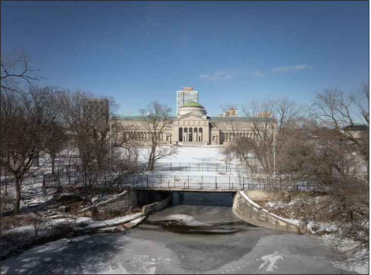 The Darrow Bridge measures 56 feet in length and 56 feet 6 inches in width, including one 40-foot-wide roadway and sidewalks measuring 8 feet 3 inches. It currently stands on the main axis of the Museum of Science and Industry and reflects the symmetry present in the museum’s exterior façade. The Columbia Basin lagoon and its naturalistic banks act as a frame, and the bridge elevates the viewer to provide the viewshed that Olmsted intended. The experience of looking out over the bridge, both to the north and the south, allows visitors in the 21st century to authentically experience Olmsted’s original South Park concept. The location and framing of the Darrow Bridge continue the long tradition of pastoral American landscape design.