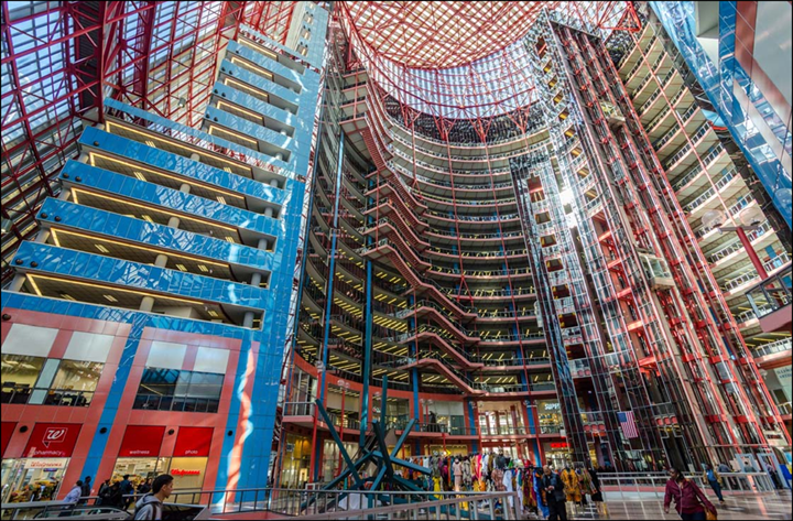 The structure’s grand, 17-story atrium is topped by a vast skylight and stepped glass curtain-wall which spans the entry and extends across most of the building’s footprint. This effect essentially creates a large public plaza both inside and outside the building’s Clark and Randolph entry and extending to the concourse level of the building. It