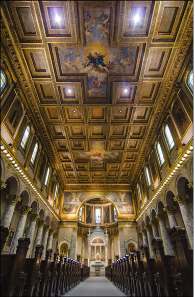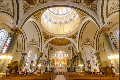 contract for all the marble work, and Professor Lamesi designed the shrines. The marble came from Carrera and was the same marble as that used by Michelangelo. The statues of St. Therese of Lisieux, Our Lady of Perpetual Help, St. Jude, St. Rita, St. Anne, Sacred Heart, St. Aloysius Gonzaga, St. Agnes, St. Raphael and St. Anthony of Padua, the large Corinthian-order columns made of scagliola, the Corinthian capitals, and the triumphal arch are breathtaking. There are arches over the side altar and over the main cupola which are remeniscant of early Roman architecture. F. X. Zettler of the Royal Bavarian Art Institute in Munich, Germany, was commissioned for the stained glass windows. Also notable are the paintings and gold coffered ceiling. The church interior was completed in time for the XXVIII international Eucharistic Congress held in Chicago in the summer of 1926.