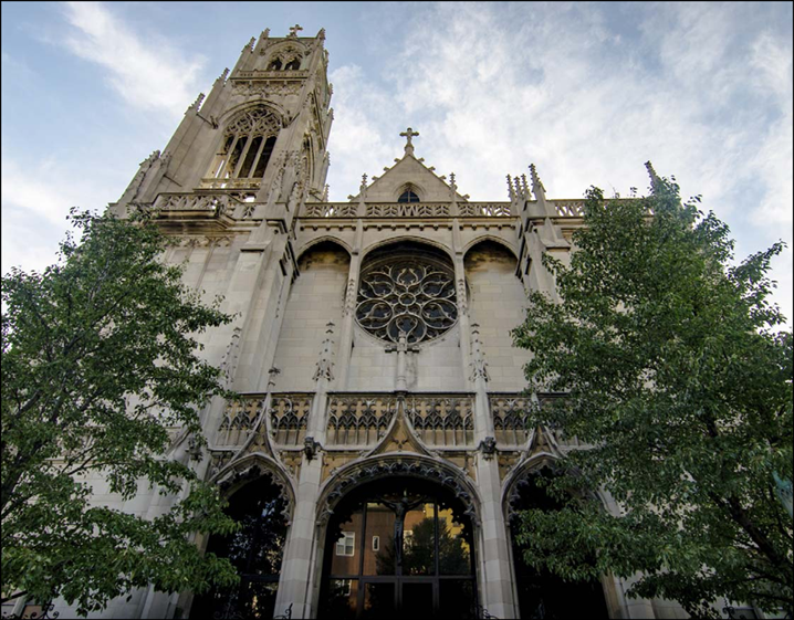 transepts and the relocation of the entire south wall 40 feet to the south in 1865-1866. The tall corner tower was designed by John Paul Huber and added to the church in 1874, atop an earlier brick and stone base. The immense 235-foot tower was said to be the city’s tallest structure until 1890— essentially, the height of a 23-story building.