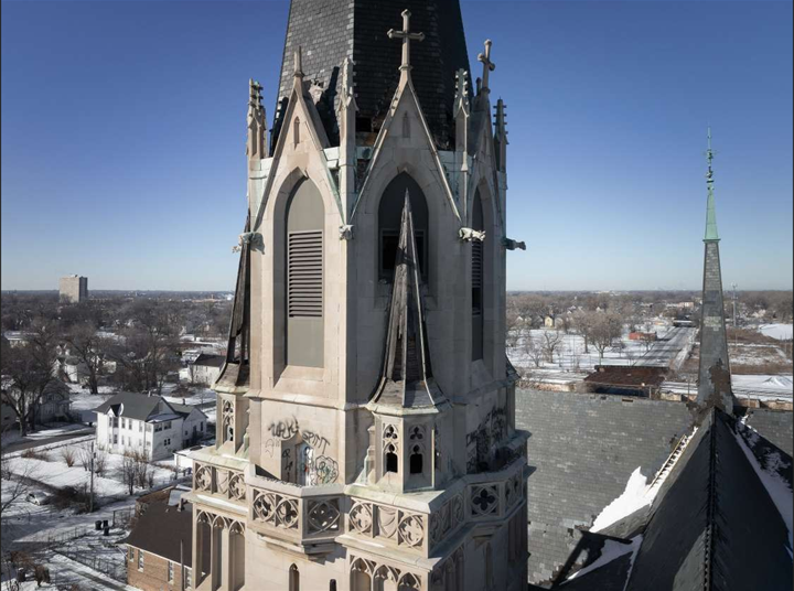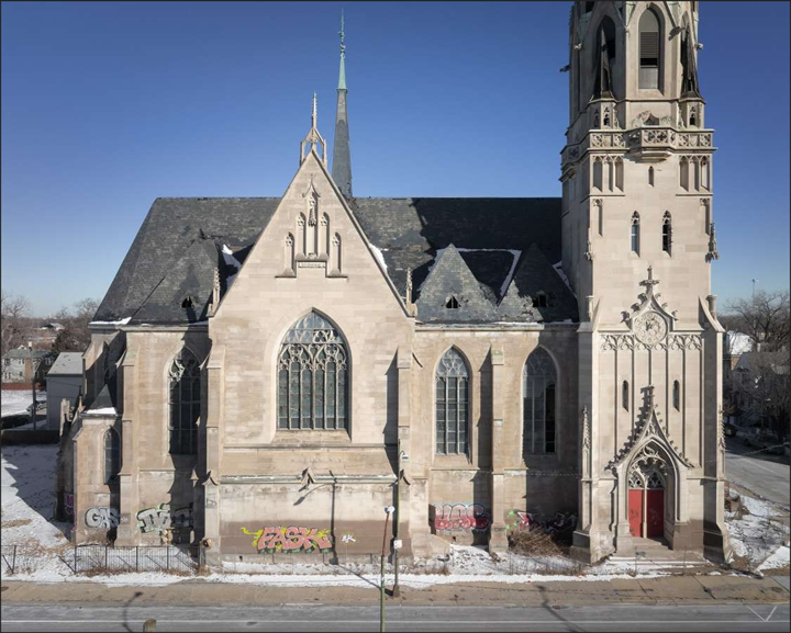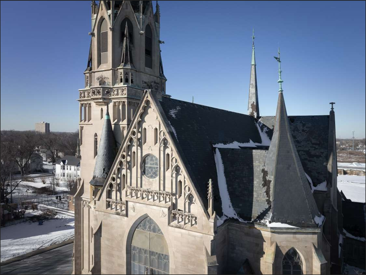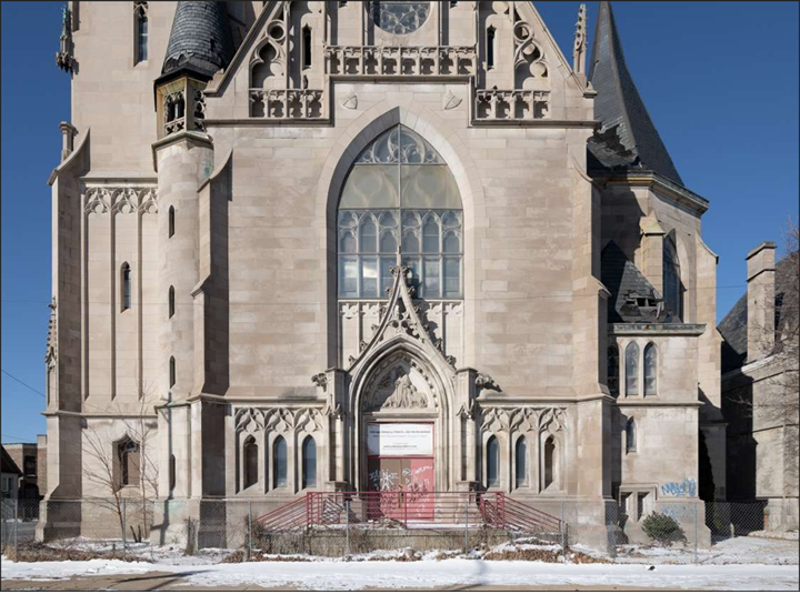 The structure’s most striking feature is its soaring 228-foot-tall steeple atop a massive tower, inset with projecting balconies, pinnacles, and even attached to a turret. The entire building has strong massing and a distinct presence from each angle. The façade is clad in Bedford limestone from Indiana, and its exterior detail is well preserved. Unfortunately, much of the stunning carved wooden interior detail has been lost, but the beautiful stained-glass windows that line the church’s nave and which were designed and manufactured in Munich and Innsbruck studios are still partially extant. The 72-register, 3,000-pipe organ built by Johnson and Son, purchased with funds hard earned by St. Martin’s original congregants, was once played at Chicago’s Central Music Hall, the city’s original Orchestra Hall, and was donated to St. Martin by Mrs. Marshall Field, Jr. The current interior of St. Martin is now quite spare and features mostly plaster and brick in poor condition.