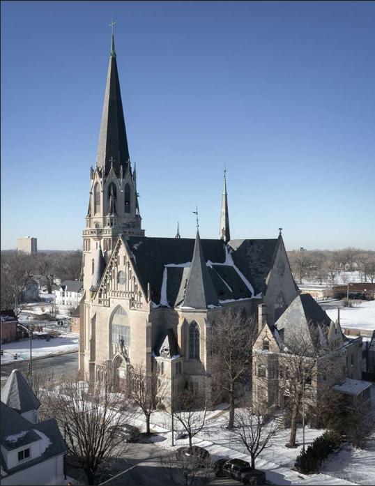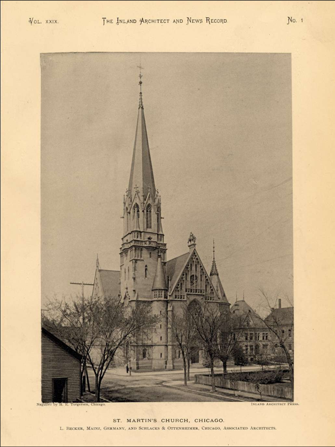 for the building were drawn up by Louis Becker of Mainz, Germany, and executed by accomplished Chicago architect Henry J. Schlacks, widely regarded as one of the city’s finest ecclesiastical architects. Trained at Massachusetts Institute of Technology (MIT) and in the offices of Adler & Sullivan, Schlacks specialized in the design and decoration of churches and later founded the Architecture Department at the University of Notre Dame in South Bend, Indiana. Per an 1894 article published in Inter Ocean Newspaper, St. Martin’s design was described as a “conscientious endeavor to put forth for the first time in Chicago, if not the country, an edifice of pure style in Gothic church architecture.” Today, St. Martin’s stands as a significant historical edifice or monument from the Gothic Revival movement in the United States and remains one of the finest examples of German Gothic architecture in the country.