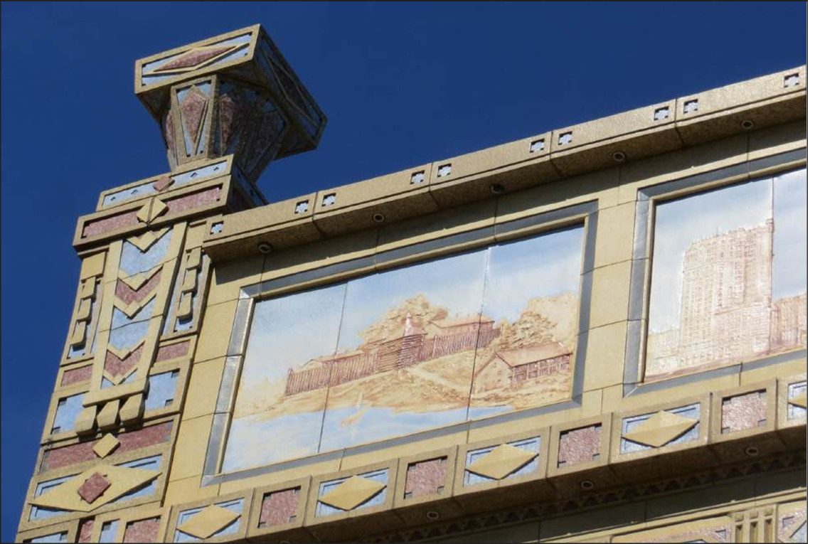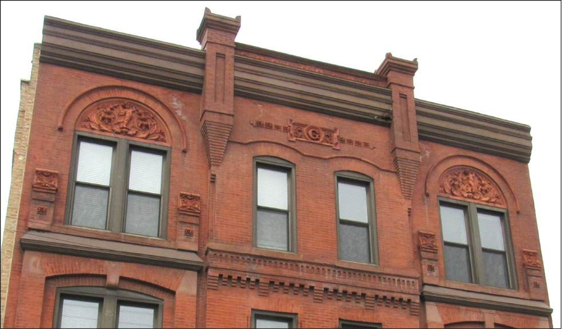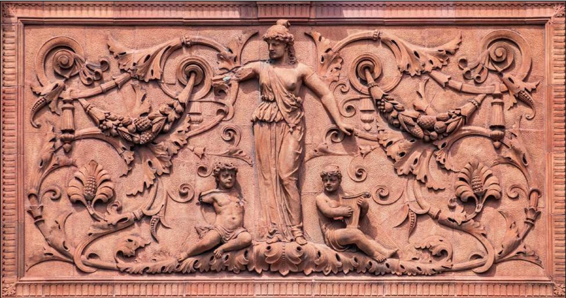 After the Great Chicago Fire, fireproof brick and stone building cladding was frequently used, but the cost of stone ornament was prohibitive. Terra cotta emerged as an ideal alternate being highly versatile, inexpensive, light-weight, and fire- proof. It could be produced in any color, pattern or texture, easily replicated, and could be molded into infinite variations. However, the golden age