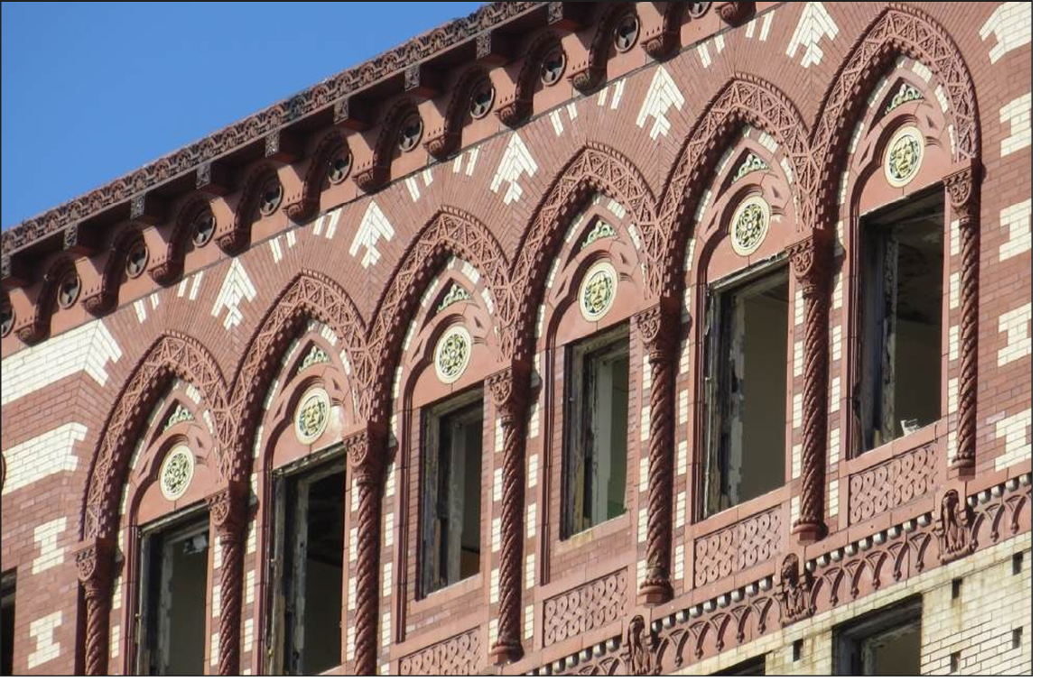 - Factory/catalog terra cotta buildings: a product of a time when whole building systems were marketed to architects, builders and developers after terra cotta shrinkage was mastered and calculated into the equation. These offerings often provided a number of standard-size blocks of terra cotta which were easily adaptable to many building sizes and types and available in a variety of architectural styles, shapes and colors. One example is that of the Midland Terra Cotta Company, which manufactured whole systems of “Sullivanesque” facades, borrowing from the vocabulary and spirit of the ornament of architect Louis Sullivan, often to his dismay. However, many terra cotta companies, including those based in Chicago, all had “ornamental systems,” with which an architect could clad a structure, often at the request of the client.