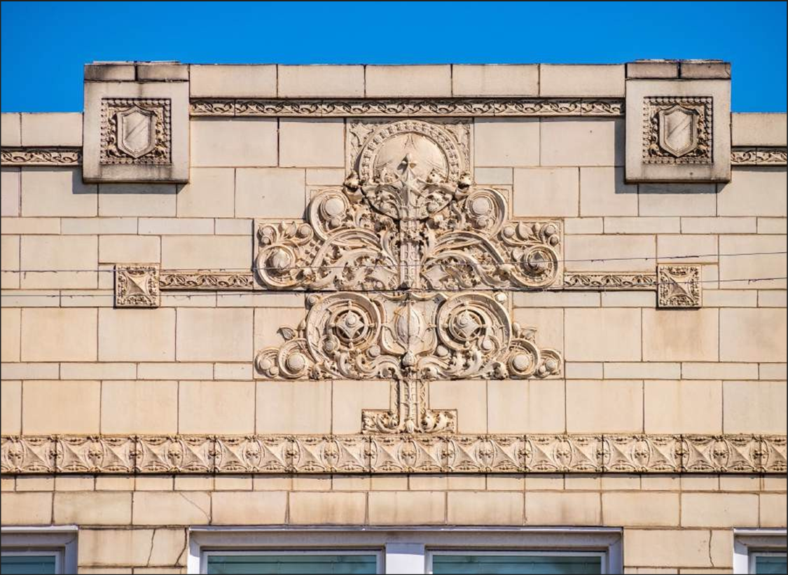 After the Great Chicago Fire, fireproof brick and stone building cladding was frequently used, but the cost of stone ornament was prohibitive. Terra cotta emerged as an ideal alternate being highly versatile, inexpensive, light-weight, and fire- proof. It could be produced in any color, pattern or texture, easily replicated, and could be molded into infinite variations. However, the golden age